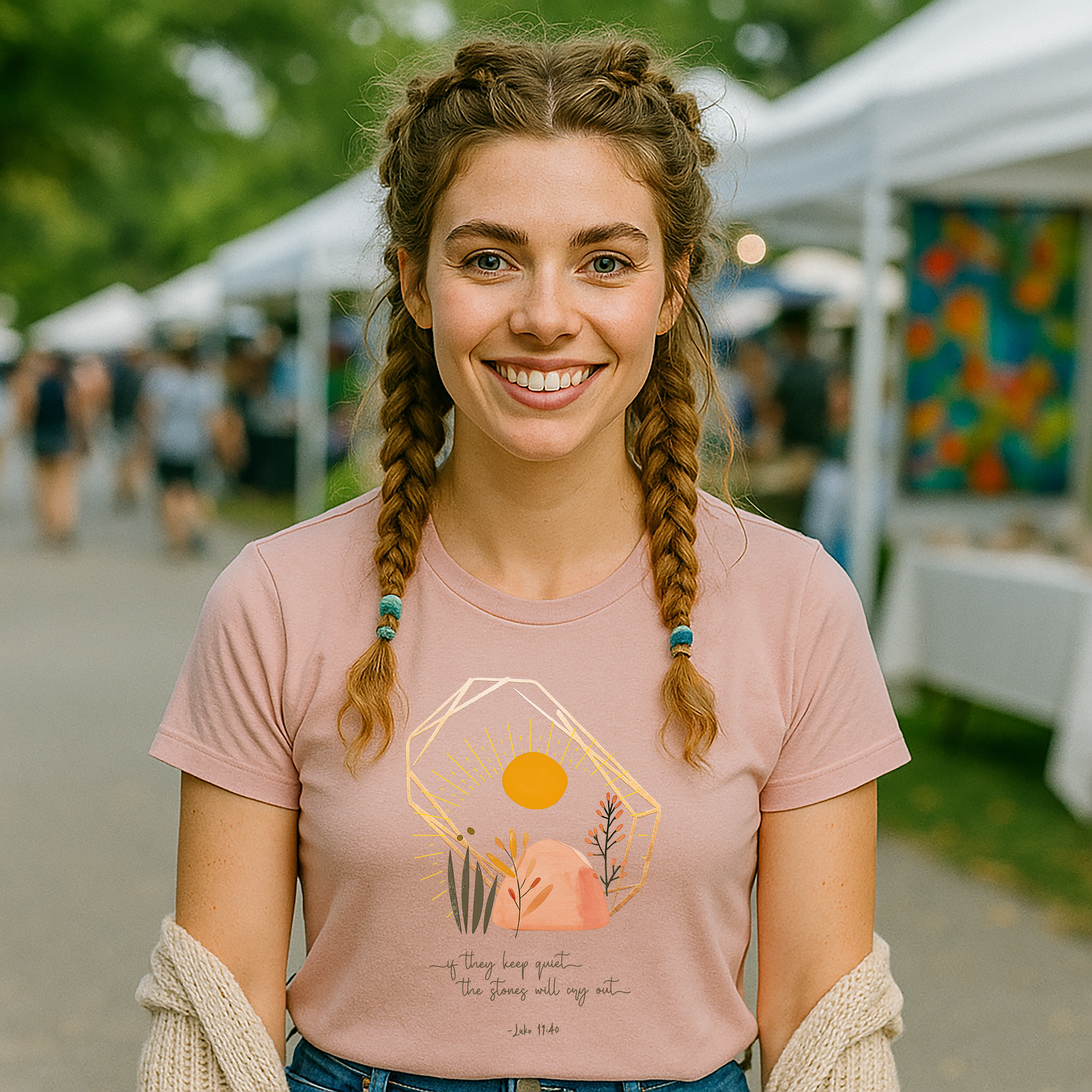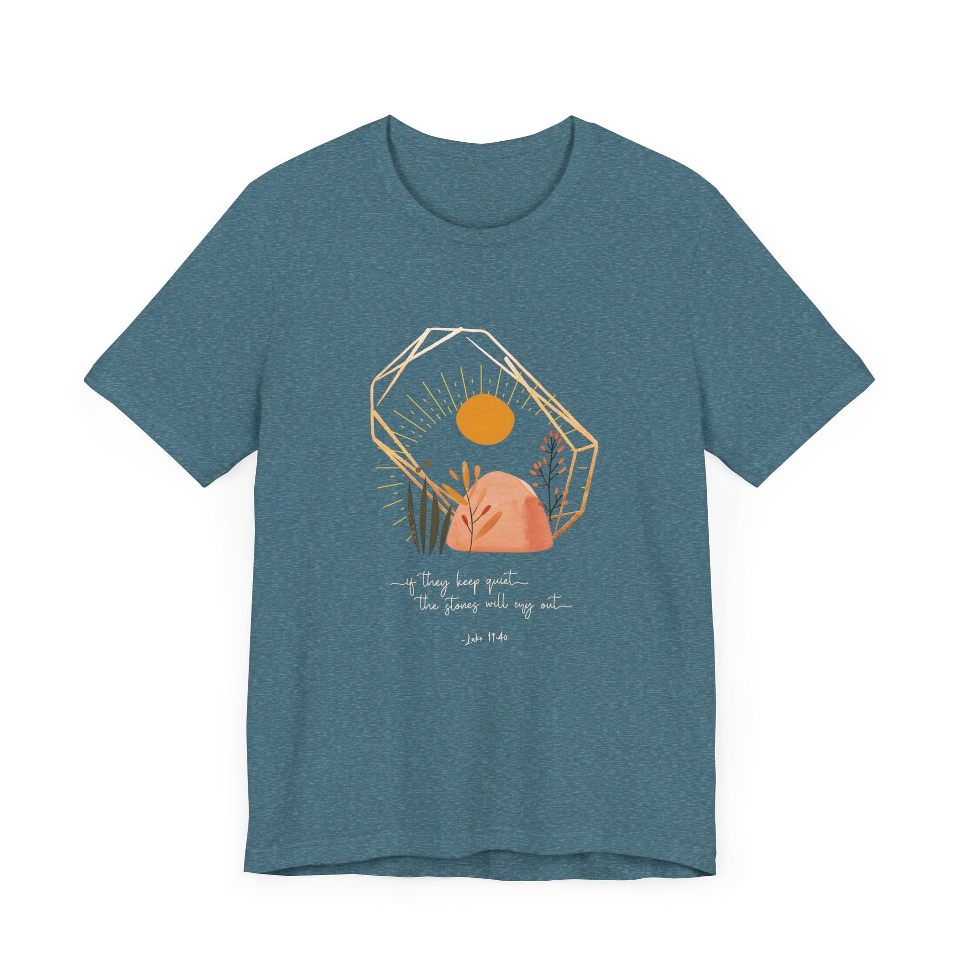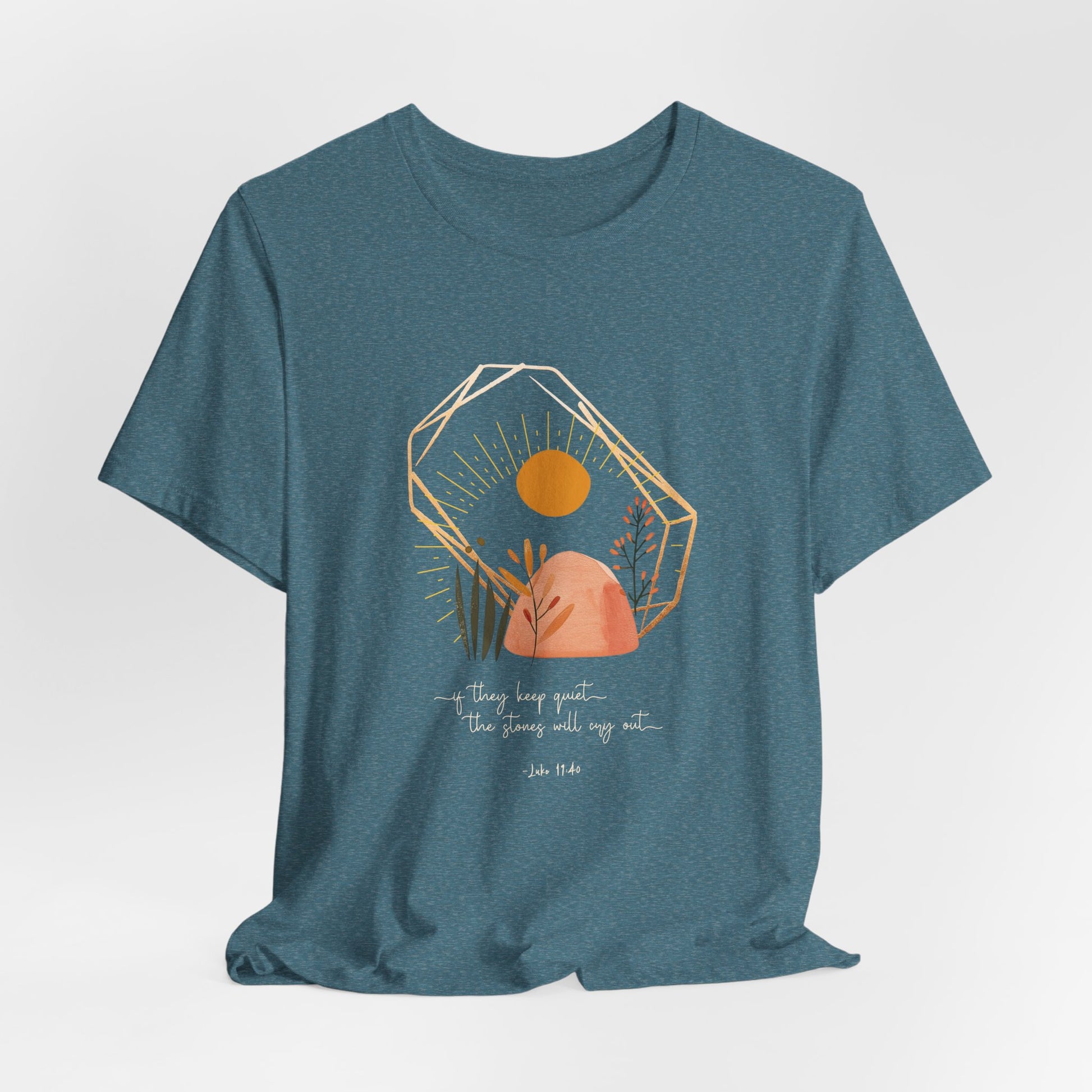 Express your faith in style with this beautifully designed Christian t-shirt inspired by Luke 19:40 — “If they keep quiet, the stones will cry out.”