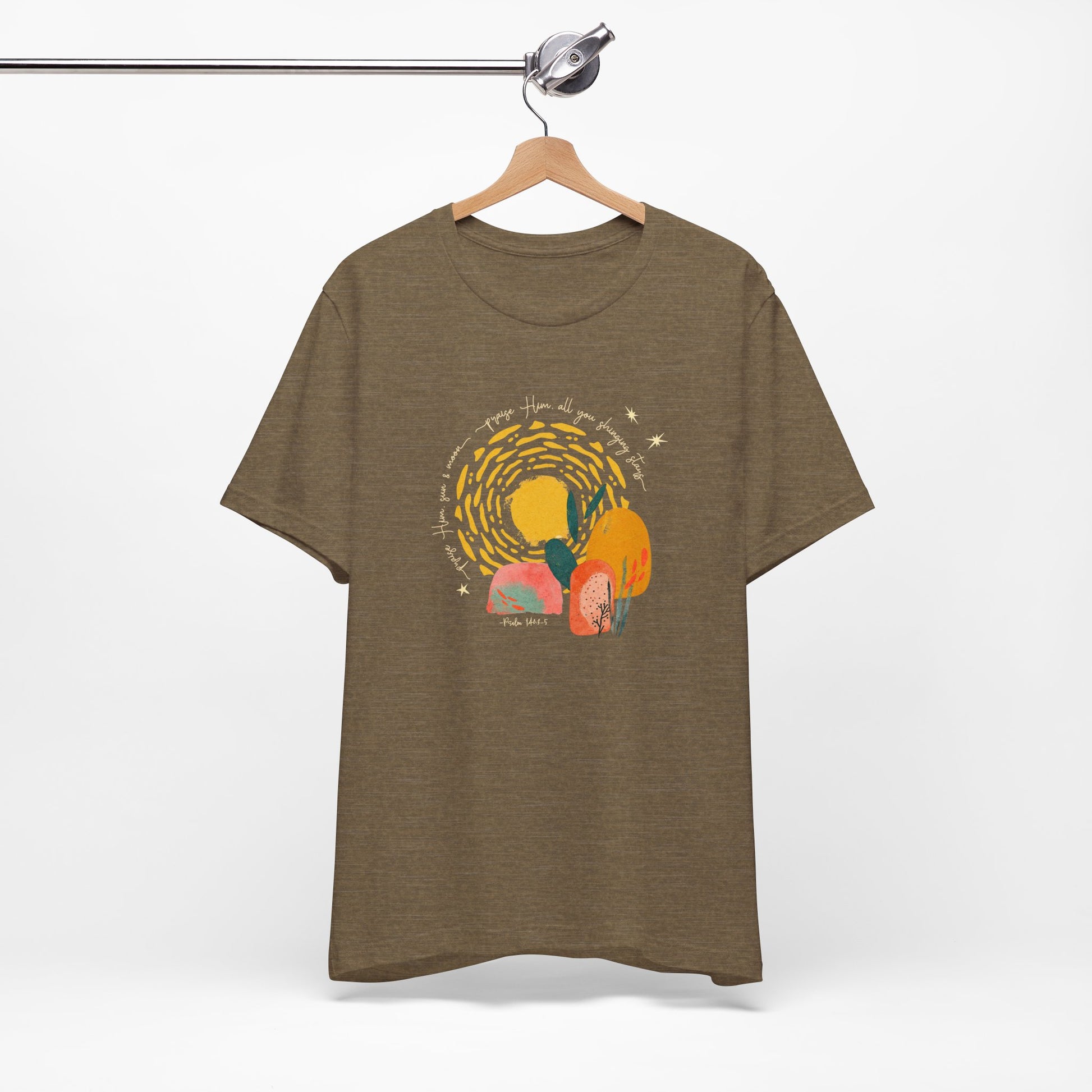 This design is drawn from Psalm 148:3–5—a visual celebration of nature lifting praise to God. Inspired by the wonder of creation, this tee radiates joyful worship in warm, earthy colors with a soft, feminine touch.